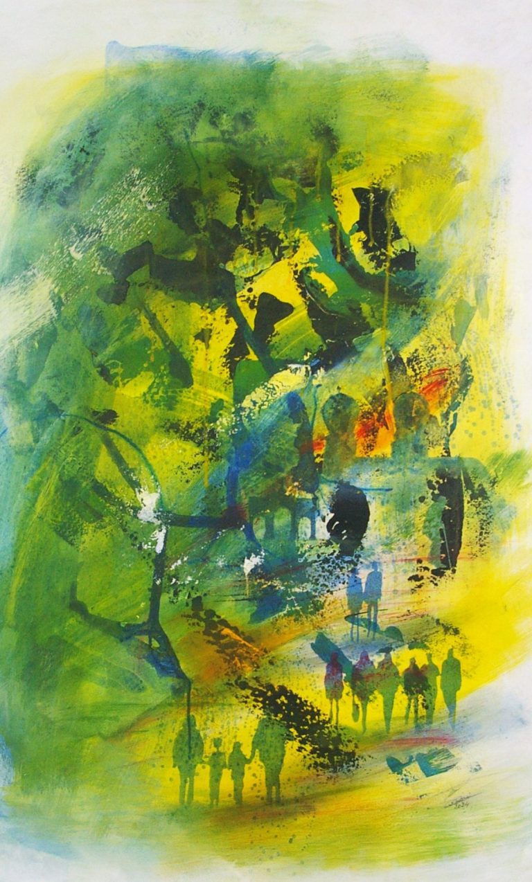 München Lebt di Serio Digitalino è un`opera astratta che celebra l`energia di Monaco attraverso una combinatione di colori vibranti e forme sfumate. L´acrrilico su legno conferisce una profondita materica, mentren il verde dominante si mescola a gialli luminosi e tocchi di blu, creando un paesaggio sureale e vivo. Le figure umane stilizzate, appena delineate, suggeriscono un contesto urbano abitato, ma allo stesso tempo evanescente, dove l`ambiente e le persone si fondono. La scelta di tonalità calda e fredde simboleggia attivita della città e la sua interazione armoniosa tra natura e cultura.